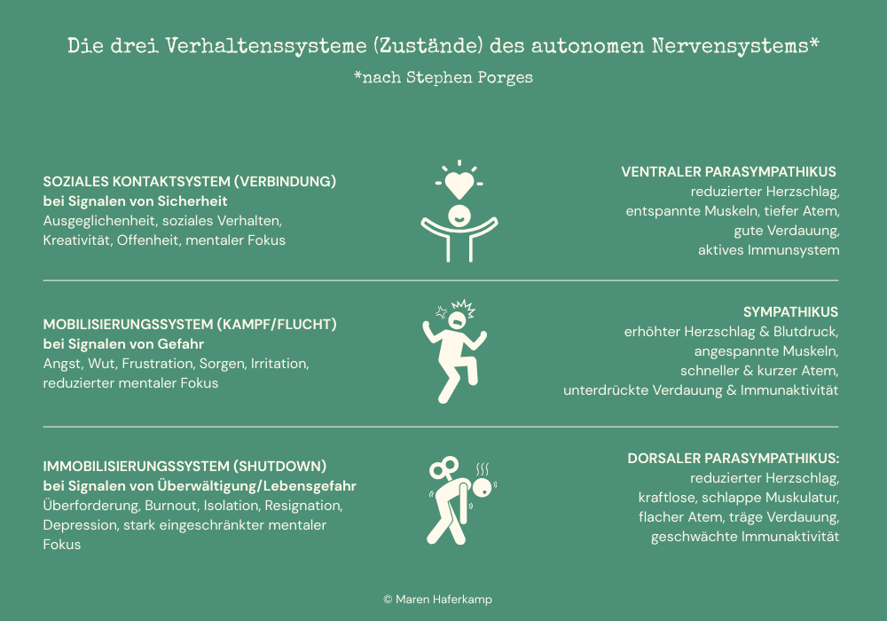 Dein Nervensystem reagiert dabei auf subjektive Signale von Sicherheit oder Gefahr im Außen und Innen (auch auf Gedanken, Sorgen, Erinnerungen) – unabhängig von der objektiven Realität!